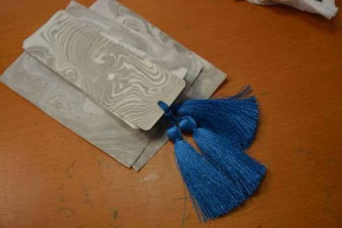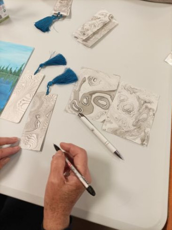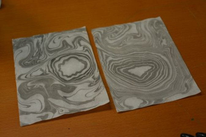 Suminagashi - starożytna japońska technika artystyczna, oznaczająca "pływający tusz", polegająca na tworzeniu wirujących wzorów na powierzchni wody, które następnie przenosi się na papier. To daje unikalne, marmurkowe efekty. Ta relaksująca forma sztuki pozwala na tworzenie wyjątkowych kompozycji. Japońską metodę dekorowania wykorzystała Joanna Demska do tworzenia zakładek do książek. W warsztatach wzięli udział seniorzy z Klubu Seniora „Głusk”.