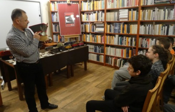 Najbardziej znane formacje wojskowe z ich charakterystycznymi czapkami, hełmami i całym żołnierskim umundurowaniem omówił Grzegorz Sztal podczas spotkania z młodzieżą 21 listopada 2019 r. w Filii nr 21.