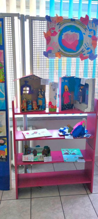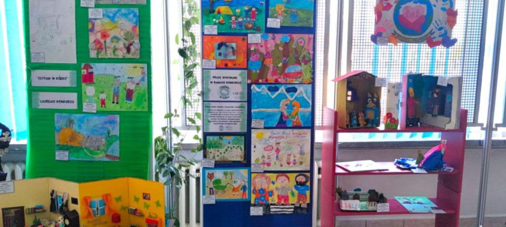 Prace dziecięce wyeksponowane w bibliotece, przedstawiające rodzinę