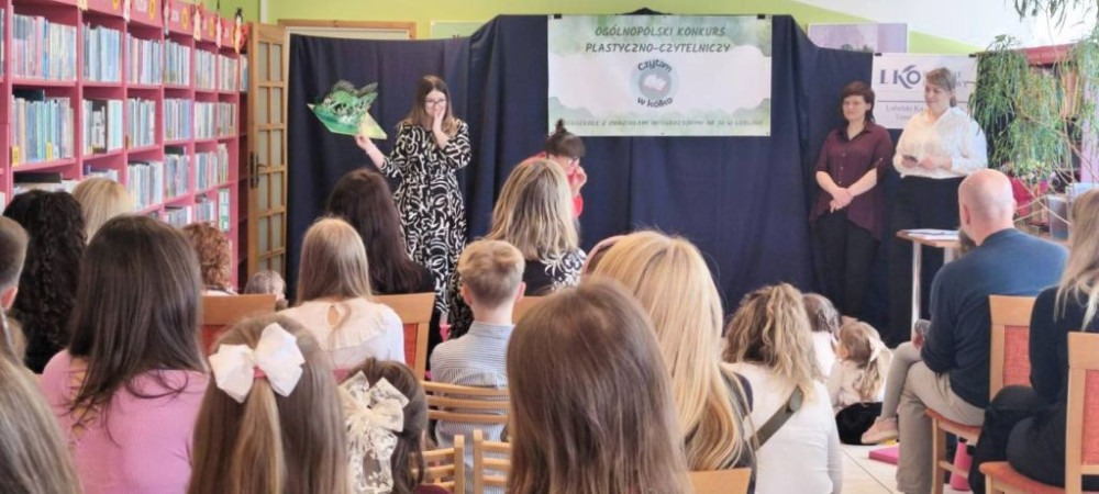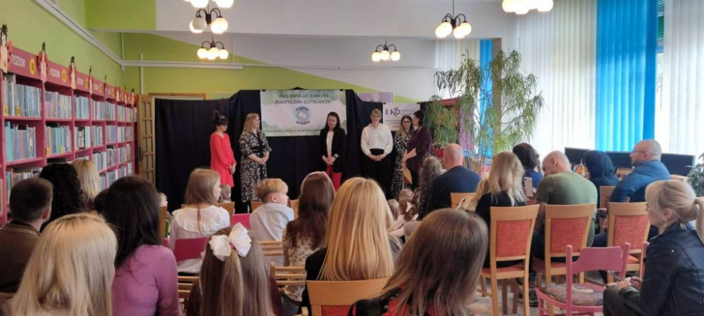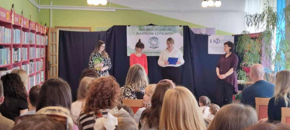 Kobiety stoją przed publicznością, w tle tytuł "Ogólnopolski Konkurs Plastyczno-Czytelniczy"
