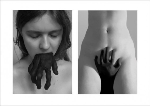 Maryia Lutsevich - [po lewej stronie portret młodej kobiety z czarną rękawiczką wyrastającą z ust; po prawej stronie nagi brzuch kobiety i czarna rękawiczka]
