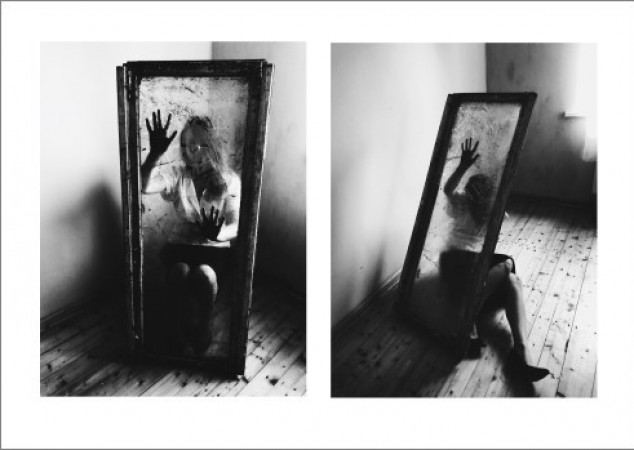 Julia Litwinek - [na dwóch fotografiach – po lewej] stronie, twarz dziewczyny odbijająca się w lusterku, po prawej stronie jej nagi tors leżący na ziemi