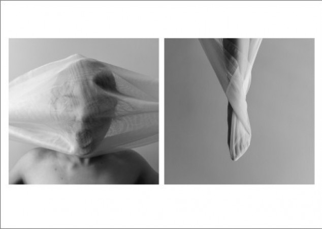 Olena Pavliuk - [na dwóch fotografiach twarz dziewczyny z otwartymi ustami i noga owinięte delikatnym woalem]