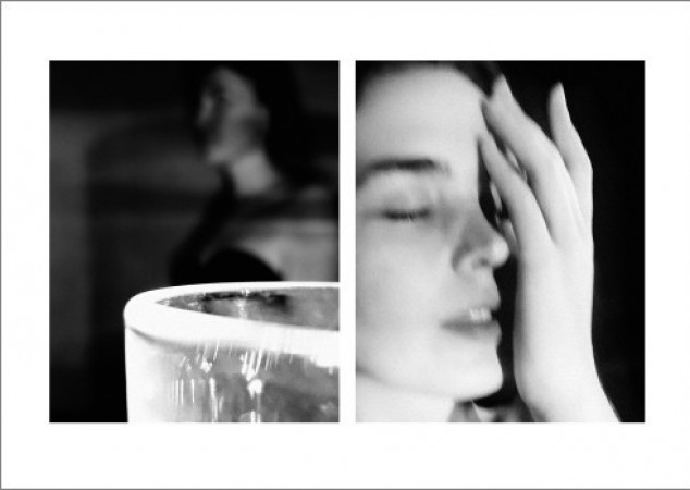 Valeriia Malashevska - [na zdjęciu po prawej stronie sylwetka pochylonej dziewczyny i duży cień szklanki na ścianie, na zdjęciu po prawej stronie cień szklanki na twarzy leżącej dziewczyny]