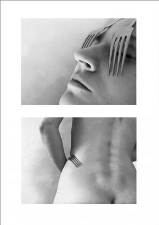 Daria Godlewska - [zdjęcie górne: twarz z oczami zasłoniętymi widelcami; na zdjęciu dolnym – ślad widelca na biodrze kobiety]