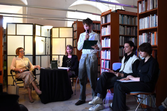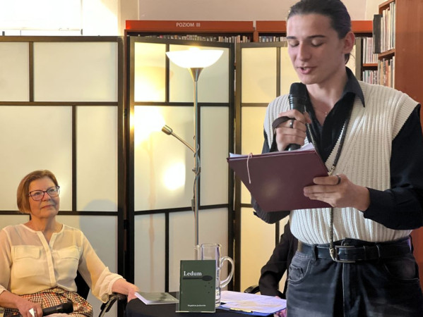 Fragment spotkania autorskiego - aktor Teatru Panopticum odczytuje wiersz poetki