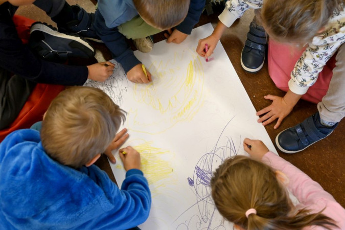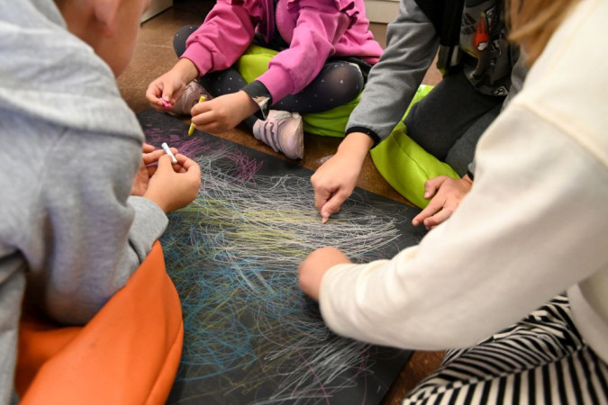 Nie zabrakło też sztuki i muzyki. W grupach dzieci malowały swoje wyobrażenia muzyki na kartonach, a następnie poruszały się w rytmie różnych utworów. Prowadząca wykorzystała te prace, by wyciąć góry i wspólnie z dziećmi stworzyć dużą ilustrację przedstawiającą Yetiego w górach, inspirowaną kartą tytułową książki.