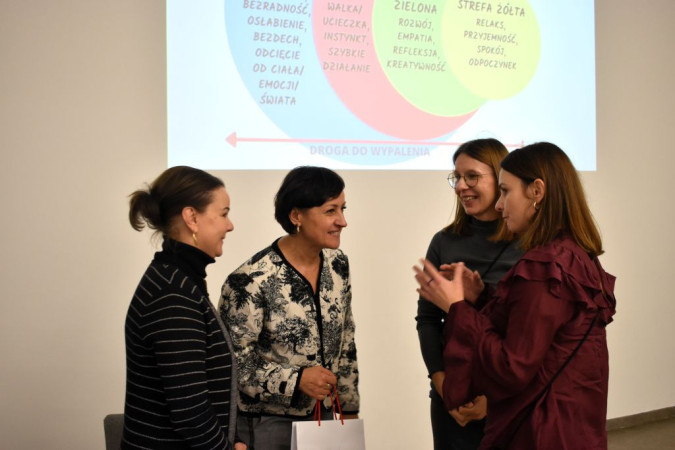 Podczas szkolenia uczestnicy przyjrzeli się zjawisku wypalenia zawodowego, które coraz częściej dotyka osoby pracujące w zawodach pomocowych, w tym bibliotekarzy. Prowadząca omówiła jego przyczyny, objawy oraz czynniki ryzyka, zarówno indywidualne, jak i wynikające ze środowiska pracy. Szczególny nacisk został położony na praktyczne sposoby dbania o dobrostan emocjonalny i fizyczny, które mogą pomóc w zapobieganiu temu zjawisku.