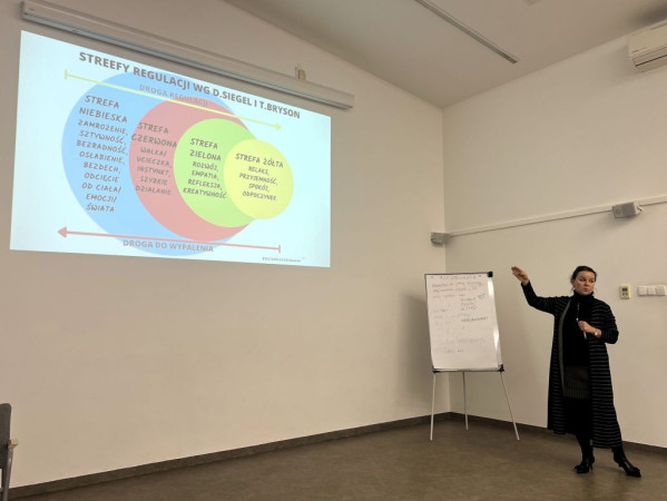Ponadto uczestnicy poznali termin kajzerki poznawczo-behawioralnej, będącej podstawowym narzędziem wykorzystywanym w terapii poznawczo-behawioralnej, przydatnym zarówno w fazie diagnozowania problemu, jak i w dalszym procesie terapeutycznym. Zapoznali się również ze strefami regulacji według G.D. Siegela i T. Brysona, które pomagają w zrozumieniu sposobów reagowania na emocje i w nauce samoregulacji.