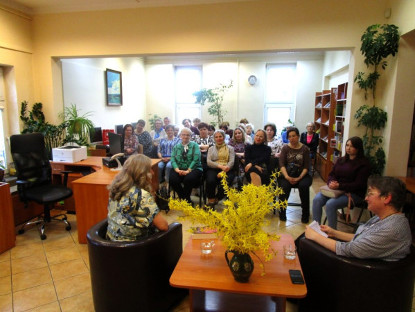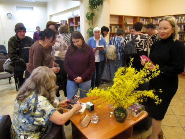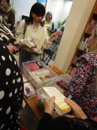 Autorka rozmawia z czytelnikami i podpisuje książki podczas spotkania autorskiego