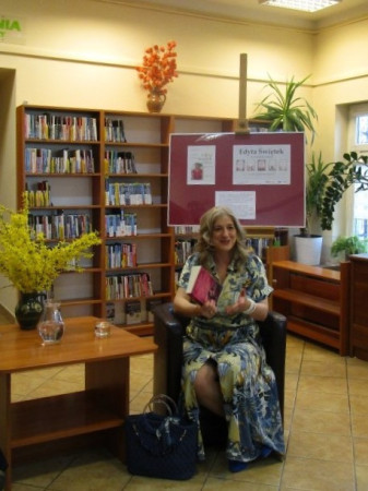 Fragment spotkania z Edytą Świętek - autorka i prowadząca przed zgromadzonymi gośćmi