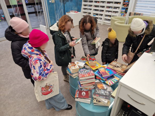 W sali biblioteki stoi długi stół, przy nim siedzą uczestnicy zajęć