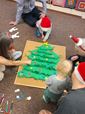 W ramach Festiwalu Bożego Narodzenia w bibliotece odbyły się wyjątkowe spotkania pełne twórczej atmosfery i świątecznej radości. Zorganizowano warsztaty haftu matematycznego, podczas których seniorki z zaangażowaniem wyszywały piękne kartki świąteczne. Również miały miejsce rodzinne warsztaty tworzenia ozdób choinkowych, które zgromadziły dzieci i dorosłych przy wspólnej pracy. Kulminacyjnym momentem było wspólne ubieranie choinki, a całe wydarzenie zakończyła wizyta Świętego Mikołaja, który obdarował uczestników prezentami. Spotkanie stało się okazją do integracji i wprowadziło wszystkich w magiczny nastrój Świąt. Dodatkowo na każdego czytelnika, który odwiedził bibliotekę czekał pięknie zapakowany prezent książkowy.