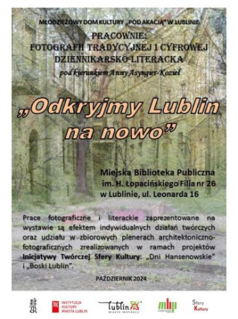 Filia nr 26 MBP przy ul. Leonarda 16 zaprasza na wystawę fotograficzno-literacką „Odkryjmy Lublin na nowo”. Wystawa to efekt rocznej współpracy Pracowni Fotografii Tradycyjnej i Cyfrowej oraz Pracowni Dziennikarsko-Literackiej Młodzieżowego Domu Kultury „Pod Akacją” w Lublinie z Inicjatywą Twórczą Sfery Kultury.