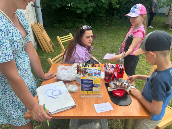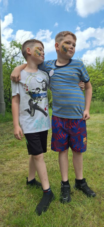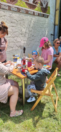 Jedną z największych atrakcji było malowanie twarzy – z powodu dużego zainteresowania na efekt trzeba było nieco poczekać, ale dzieci cierpliwie stały w kolejce. Dużą popularnością cieszyły się również brokatowe tatuaże. Wybór był imponujący: od małych, delikatnych gwiazdek, po większe, kolorowe motywy. Dzieciaki wybierały swoje ulubione wzory, a później z dumą prezentowały je na rękach i nogach. Animatorka prowadziła szereg dynamicznych gier i zabaw angażujących dzieci w różnym wieku, z niezwykłą energią potrafiła świetnie nawiązać kontakt z dziećmi, które chętnie uczestniczyły we wszystkich aktywnościach, śmiejąc się i rywalizując w przyjaznej atmosferze. Dla wszystkich preferujących spokojniejsze zajęcia przygotowano kącik czytelniczy, gdzie dzieci mogły w ciszy i spokoju przeglądać książki. Był też wybór gier planszowych – zarówno dla młodszych, jak i dla starszych dzieci. Przygotowany został również kącik labiryntów i kolorowanek. Nie można pominąć warsztatów robienia przypinek. Dzieci z pomocą bibliotekarza tworzyły własne, unikatowe przypinki, które chętnie nosiły przez całą imprezę. Zaprzyjaźniony żłobek „Mali Odkrywcy” włączył się do zabawy i przygotował balonowe upominki. Dzień Dziecka z biblioteką to był strzał w dziesiątkę!