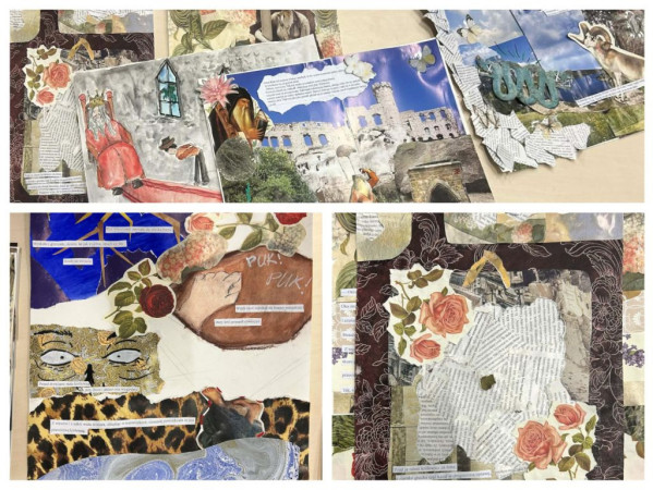 Gotowe prace w technice kolażu przygotowane przez uczestniczki