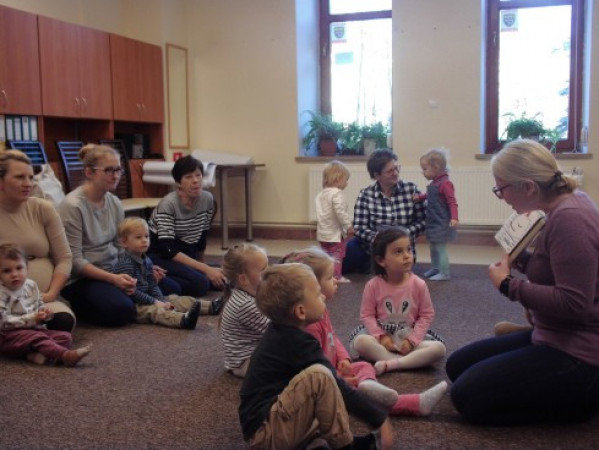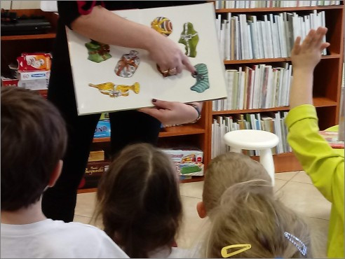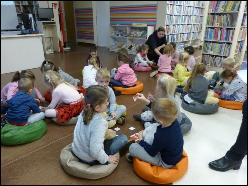 Widok ogólny na salę, dzieci i bibliotekarkę