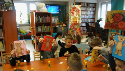 Pluszowe niedźwiadki są ulubionym towarzyszem dziecięcych zabaw. Uwielbiają je nie tylko najmłodsi ale również i dorośli. W tym szczególnym dniu Pluszowego Misia Filię 34 odwiedziły na dwóch spotkaniach cztery grupy dzieci z Przedszkola Mistrzów Zabawy. Przedszkolaki dowiedziały się skąd misie wzięły się na świecie. Pluszowi przyjaciele stali się również inspiracją wielu dziecięcych bajek. Dzieci poznały wybrane książkowe i filmowe postaci niedźwiadków.  Nie mogło zabraknąć misia Wojtka, który był prawdziwym niedźwiedziem brunatnym a zarazem żołnierzem II Korpusu Armii Andersa. Spotkaniu towarzyszyły misiowe zabawy ruchowe oraz wspólne tworzenie papierowych pszczółek, które dzieci zabrały ze sobą do przedszkola. Dzień Pluszowego Misia w Filii 34 trwał nieco dłużej, gdyż kolejnego dnia najmłodsze dzieci z Przedszkola Mistrzów Zabawy odwiedził Biblioteczny Miś. Opowiedział on maluchom historię o tym jak szukał swojego serca, rozbawił dzieci opowieścią o ucieczce z zoo, przeprowadził poranną gimnastykę, poprosił przedszkolaki o namalowanie jego portretu i jak na misia przystało pożegnawszy się z dziećmi wrócił do swojej gawry, gdzie zapadł już w zimowy sen.