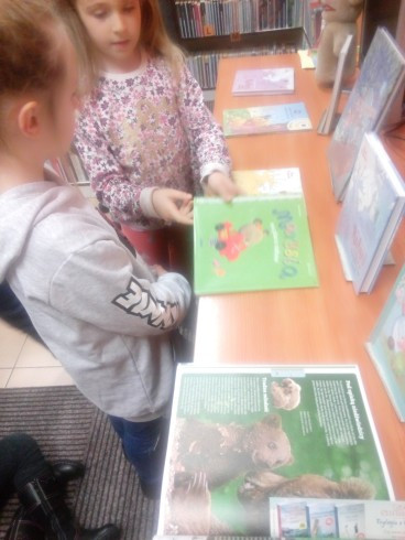 Bibliotekarka pokazuje na plaszy zgadki