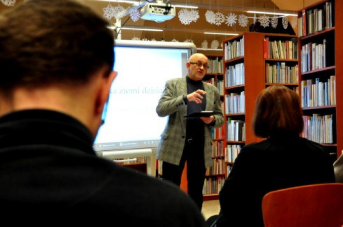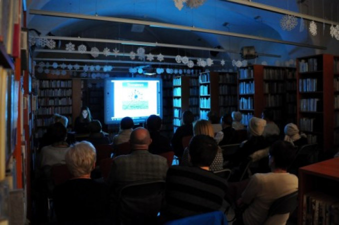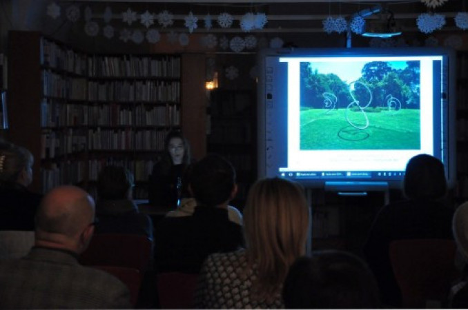 Wykład w Filii nr 2 dotyczył sztuki współczesnej, w której odbicie znalazły nurty i zagrożenia współczesnego świata dotyczące środowiska naturalnego. Twórczość artystyczna, której obszarem działania jest przestrzeń ziemi łączy naturę ze sztuką czerpiąc z ulotnych substancji zjawisk atmosferycznych, takich jak: deszcz, śnieg czy topniejące lodowce. Tworzy dzieła, dla których płótnem jest np. piasek, fale.