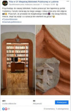 Tydzień Bibliotek 2020 pod hasłem "Zasmakuj w Bibliotece" był okazją do przybliżenia czytelnikom bogatej historii Filii nr 21 i kamienicy w Rynku 11. Na fanpage'u Biblioteki codziennie pojawiały się pytania i zagadki oraz posty pełne wiedzy i zdjęć ukazujących m.in. detale architektoniczne wielowiekowych wnętrz. Opublikowana w czwartek interaktywna oś czasu była podróżą we wspomnienia, powrotem do koncertów, akcji czytelniczych, lekcji bibliotecznych i spotkań z wyjątkowymi gośćmi. Wszystkie działania filii są do obejrzenia na stroniefacebookowej filii