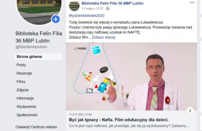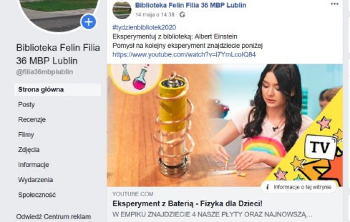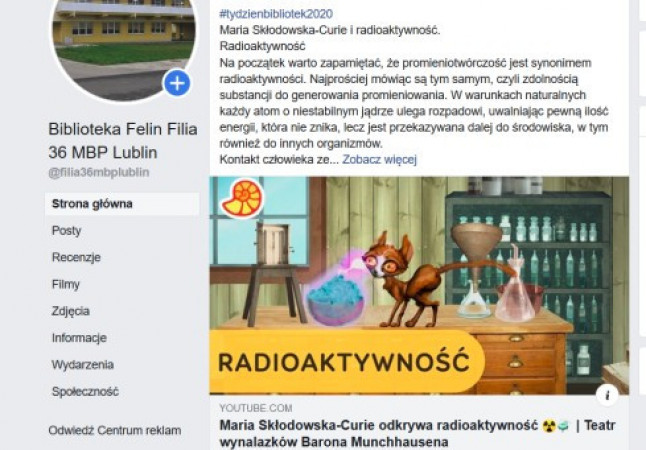 W ramach Tygodnia Bibliotek Filia nr 36 przygotowała propozycje dla trzech grup wiekowych. Dla najmłodszych były to „Poranki z bajką”. Codziennie prezentowaliśmy inną opowieść w formie teatrzyku kamishibai. Z nieco starszymi odkrywaliśmy tajemnice fizyki zachęcając przy tym do samodzielnych eksperymentów. W ten sposób uczciliśmy Rok Fizyki. Dorośli mogli wirtualnie obejrzeć wystawę „Jan Paweł II - sportowiec i turysta”, wpisującą w obchody Roku Świętego Jana Pawła II. Wszystkie działania filii są dostępne na stronie facebookowej filii.
