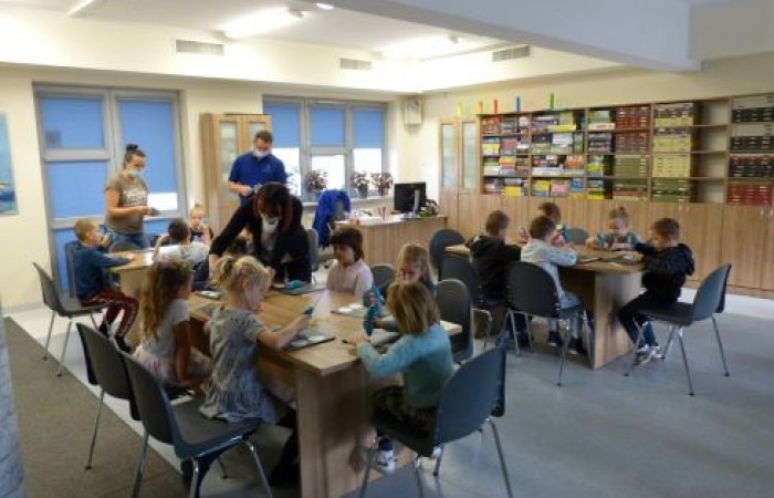 Dzieci siedzące przy stołach, stojący kobieta i mężczyzna