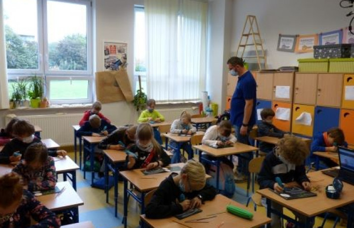 Mężczyzna w granatowym swetrze i dzieci siedzące w ławkach szkolnych
