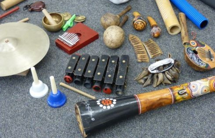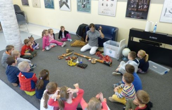 Kobieta w niebieskim stroju pokazuje instrument grupce dzieci