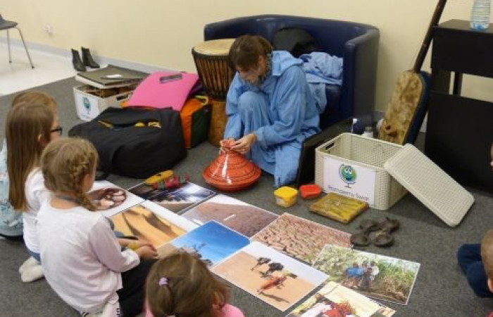 Dorośli i dzieci zgromadzone wokół prowadzącej
