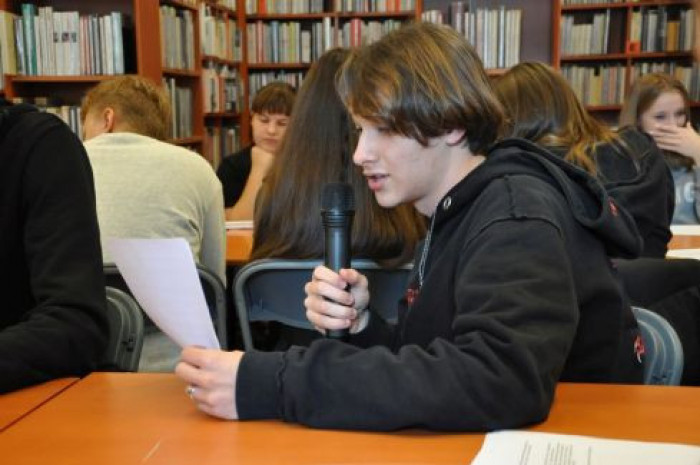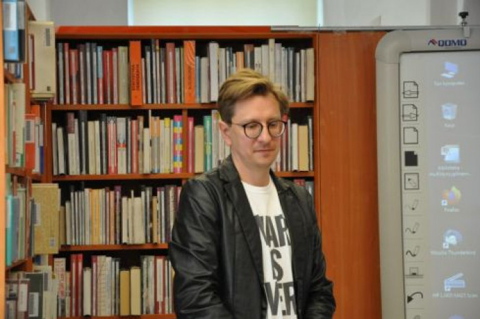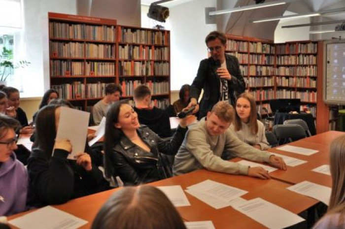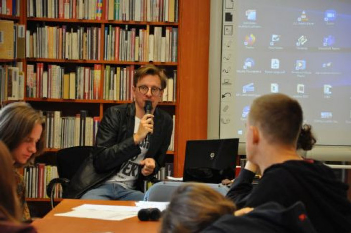 Mężczyzna z mikrofonem siedzi na tle regałów z książkami. Na pierwszym planie głowy licealistów