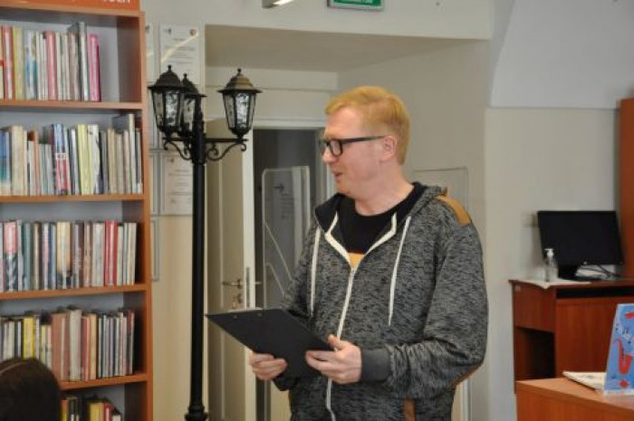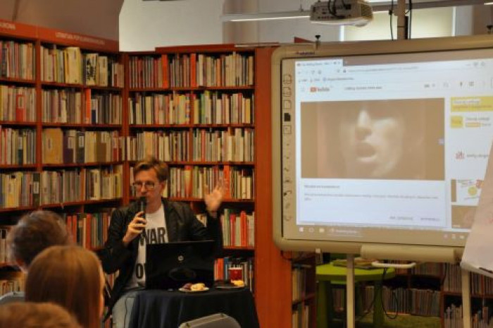 W pomieszczeniu bibliotecznym mężczyzna zapowiada wydarzenie