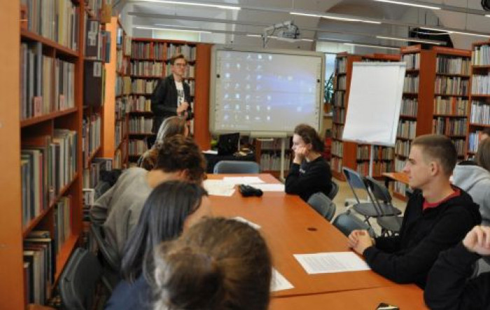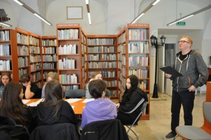 W bibliotece przy stole siedzi młodzież obok stoi mężczyzna w szarym swetrze i czarnych spodniach