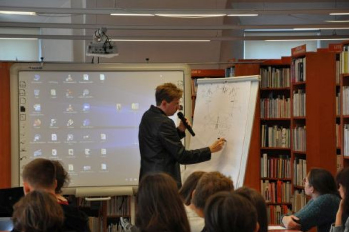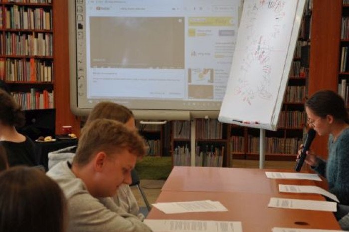 Na pierwszym planie młodzież siedząca przy stołach, na drugim prowadzący warsztaty obok niego tablica flipchart i multimedialna