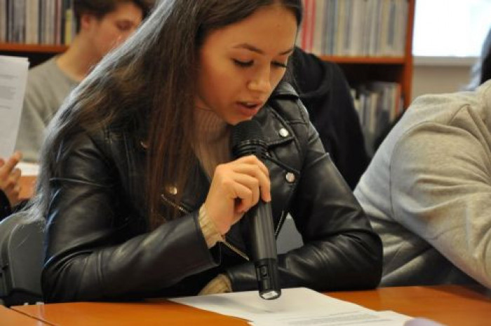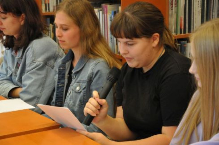 Cztery licealistki siedzą w rzędzie przy stole, jedna trzema mikrofon i czyta z kartki