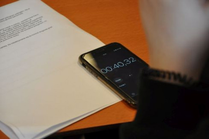 Na stole, częściowo na kartce z tekstem leży smartfon z włączonym stoperem i odlicza czas
