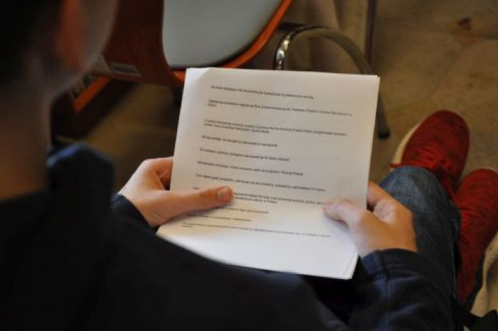 Siedzący na krześle chłopak trzyma w dłoniach kartkę z tekstem