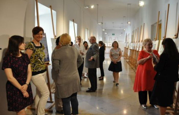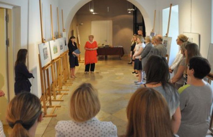 Uczestnicy wernisażu słuchają informacji o prezentowanych na wystawie ilustracjach