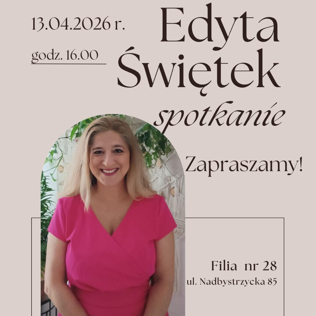 Filia nr 28 MBP zaprasza na spotkanie z Edytą Świętek - autorką powieści społeczno-obyczajowych.