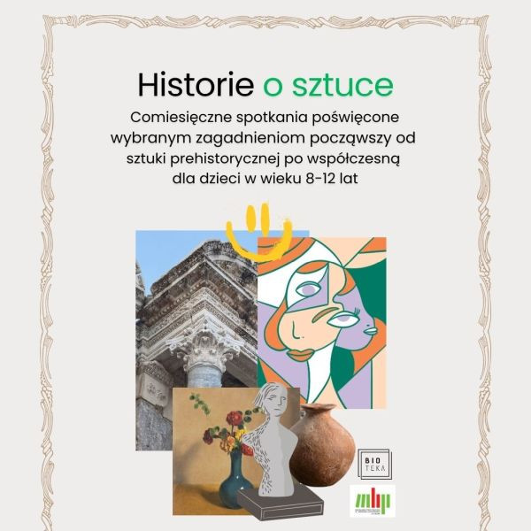 Bioteka (Filia nr 6 i 27, Al. Racławickie 22) zaprasza na Historie o sztuce - comiesięczne spotkania poświęcone wybranych zagadnieniom począwszy od sztuki prehistorycznej po współczesną dla dzieci w wieku 8-12 lat.